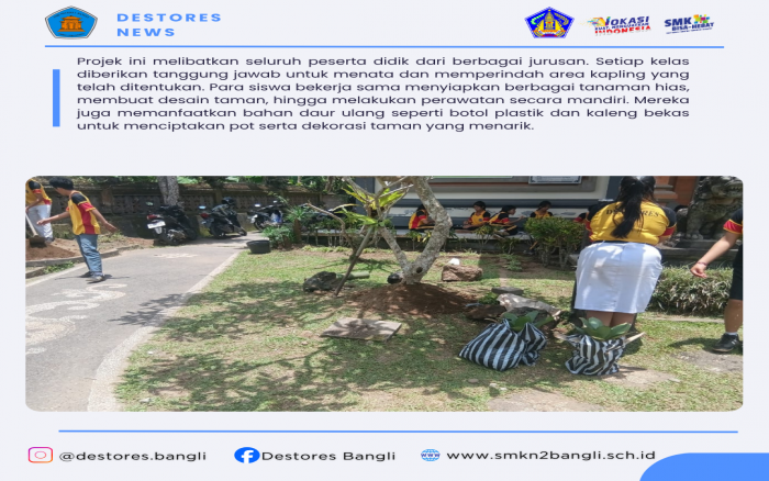 Bangli, 17 Oktober 2025 — Dalam rangka pelaksanaan ProjekKokurikuler (KOKULINER) tahun pelajaran 2025/2026, para siswa SMK Negeri 2 Bangli melaksanakan kegiatan bertema“Menciptakan Lingkungan Sekolah yang Hijau dan Asri” dengan membuat taman di setiap kapling kelas. Kegiatan ini berlangsung selama sepekan, mulai Senin, 12 Oktober hingga Jumat, 17 Oktober 2025, di lingkungan sekolah SMK Negeri 2 Bangli.