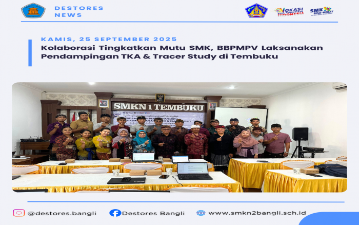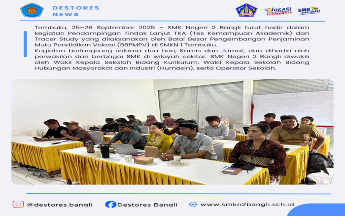 SMK Negeri 2 Bangli hadir dalam kegiatan Pendampingan TKA & Tracer Study yang dilaksanakan oleh BBPMPV di SMKN 1 Tembuku pada Kamis–Jumat, 25–26 September 2025.